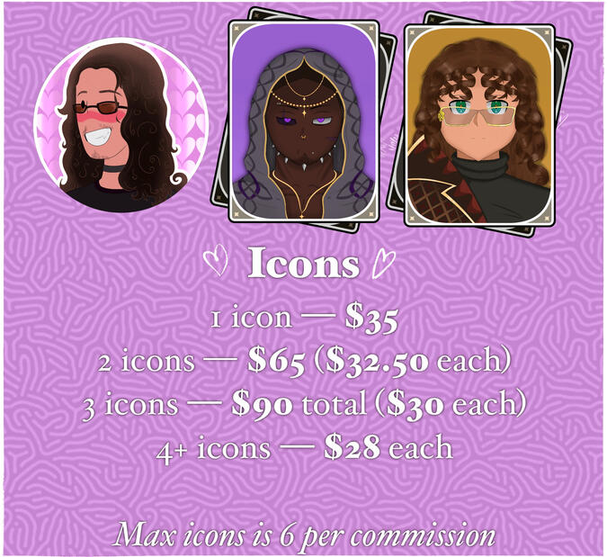 An Icon is a portrait of whatever or whoever you wish for me to commission with polished lineart, rendering, effects, and a simple background of your choosing. These are commonly used as profile pictures (PFPs) for social media accounts!