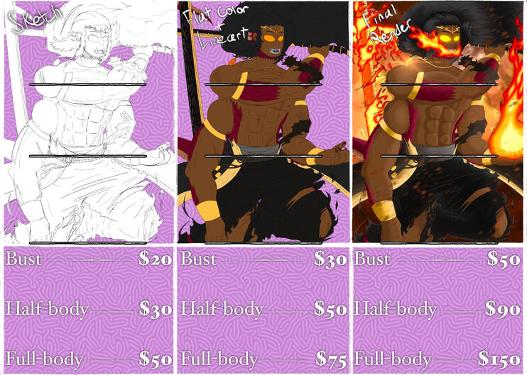 Hi there! Your interest is greatly appreciated! Below is an important notice!Wait TimesThe more the request the longer the wait!Since I am currently a uni student, while I promise to give you what you deliver as fast as I can, big pieces involving fully rendered full-body characters can take at maximum a few months if not more to fully be finished, especially depending on how complex you wish for it to be. So it is imperative to be patient as the commission process goes on!